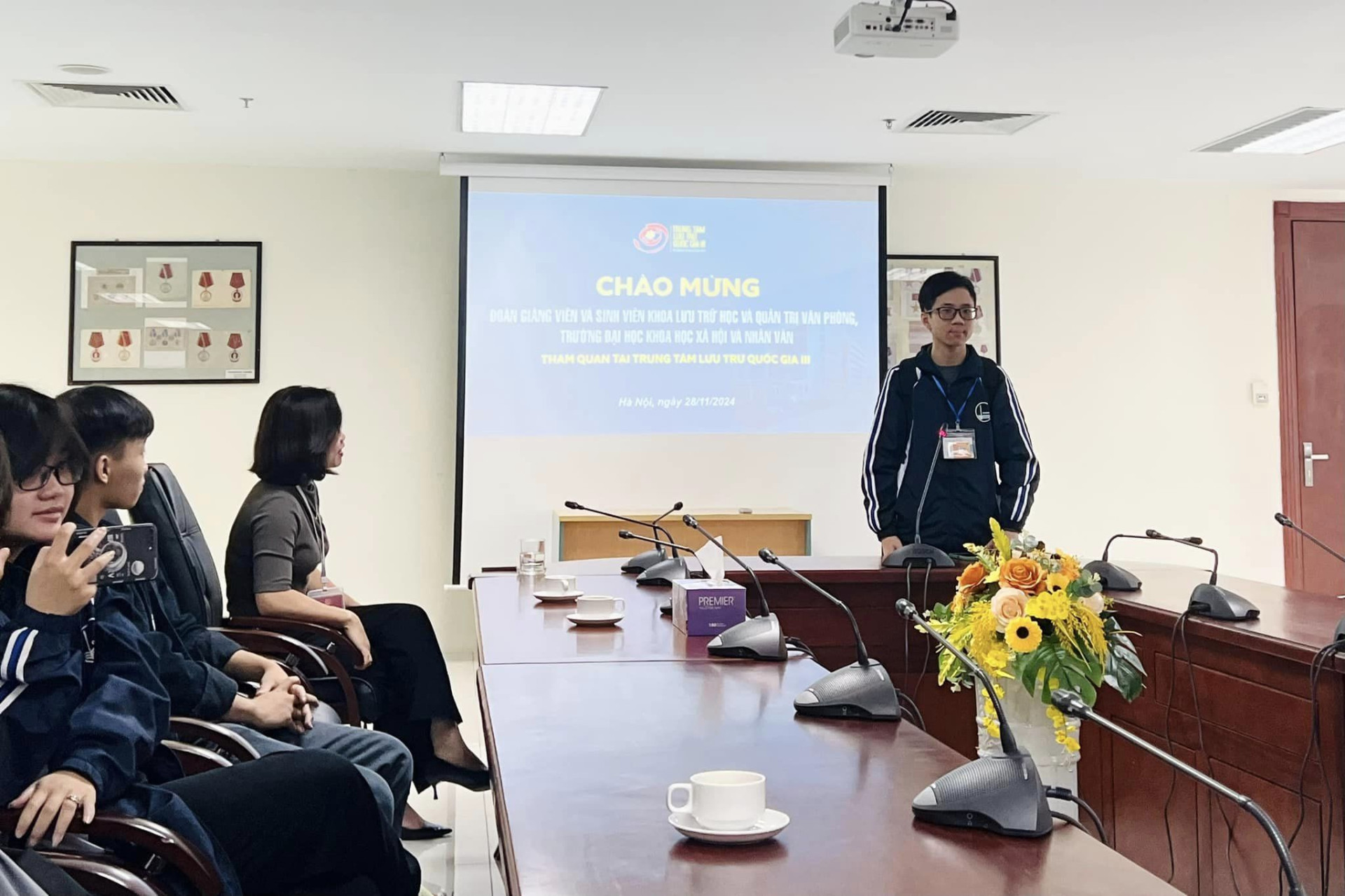 Tại Phòng họp của Trung tâm, sinh viên được nghe giới thiệu nhiều hoạt động, nghiệp vụ bổ ích Trung tâm Lưu trữ quốc gia III đã và đang thực hiện.